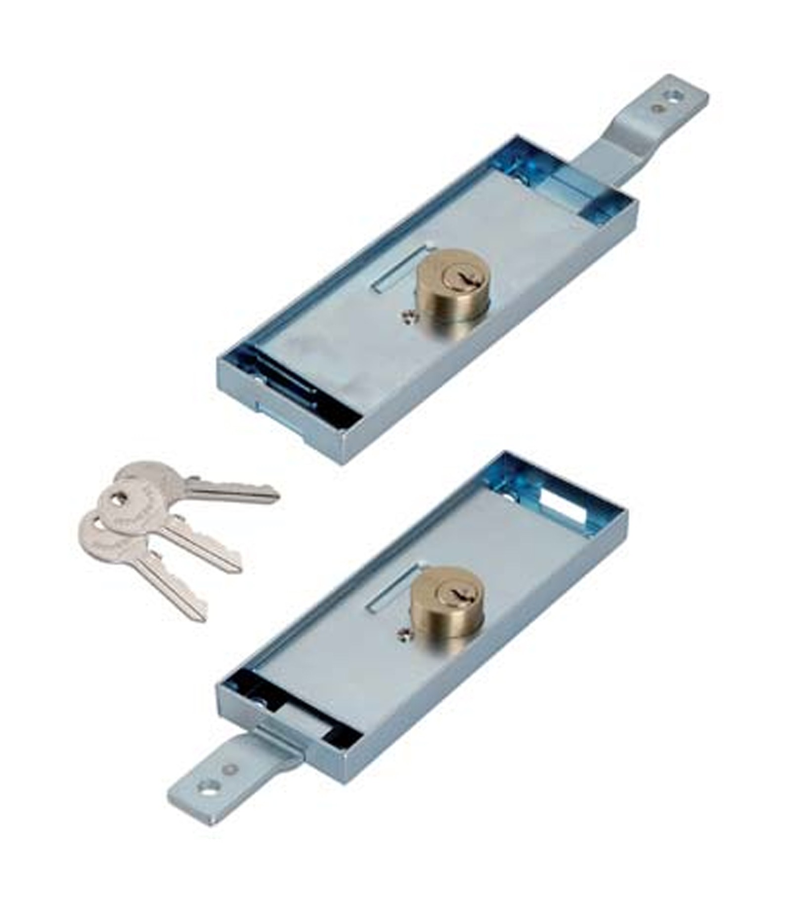 Cifratura KA a coppia. Con cilindro tondo fisso da Mm. 25 di diametro. Per installazione laterale con catenaccio piegato. Movimentazione con chiave sia dall esterno che dall interno. Corsa catenacci Mm. 24. Scatola in acciaio zincato da Mm. 157x56, spessore Mm. 15,5. In dotazione: 3 chiavi piatte.