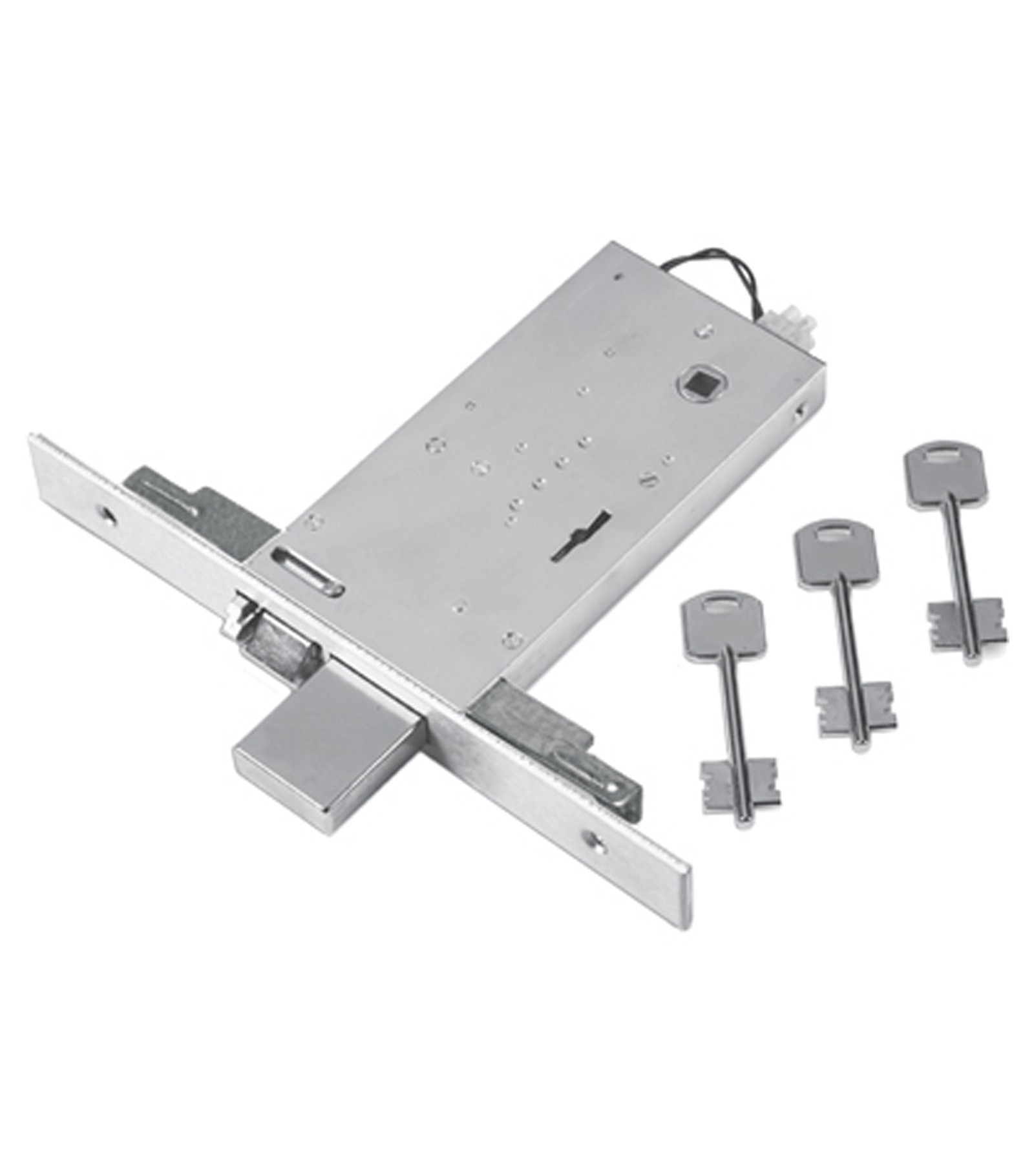 A doppia mappa. Con scrocco reversibile elettrificato 12V. Chiusura triplice con catenaccio a 4 mandate e asole per montaggio aste. Frontale in acciaio inox con bordo quadro da Mm. 25x240. Altezza scatola Mm. 81. In dotazione 3 chiavi.