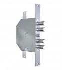 A doppia mappa. Scrocco reversibile, azionabile da chiave o maniglia. Chiusura triplice con catenaccio a 4 pistoni e 4 mandate, corsa Mm. 38, e predisposizione per chiusura aste, corsa Mm. 19. Quadro maniglia Mm. 8, interasse Mm. 72. Frontale con bordo quadro zincato da Mm. 35x294. Scatola Mm. 130x164. In acciaio zincato. In dotazione: 3 chiavi, 1 chiave da cantiere, mostrine e viti per il fissaggio.