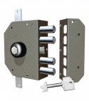Scrocco. Chiusura triplice con catenaccio a 4 pistoni e 4 mandate, corsa da Mm. 38, e predisposizione per fissaggio aste. Scatola Mm. 130x164. Bocchetta Mm. 49x164. In acciaio verniciato. In dotazione: 3 chiavi, 1 ferrogliera, 1 mostrina e viti.