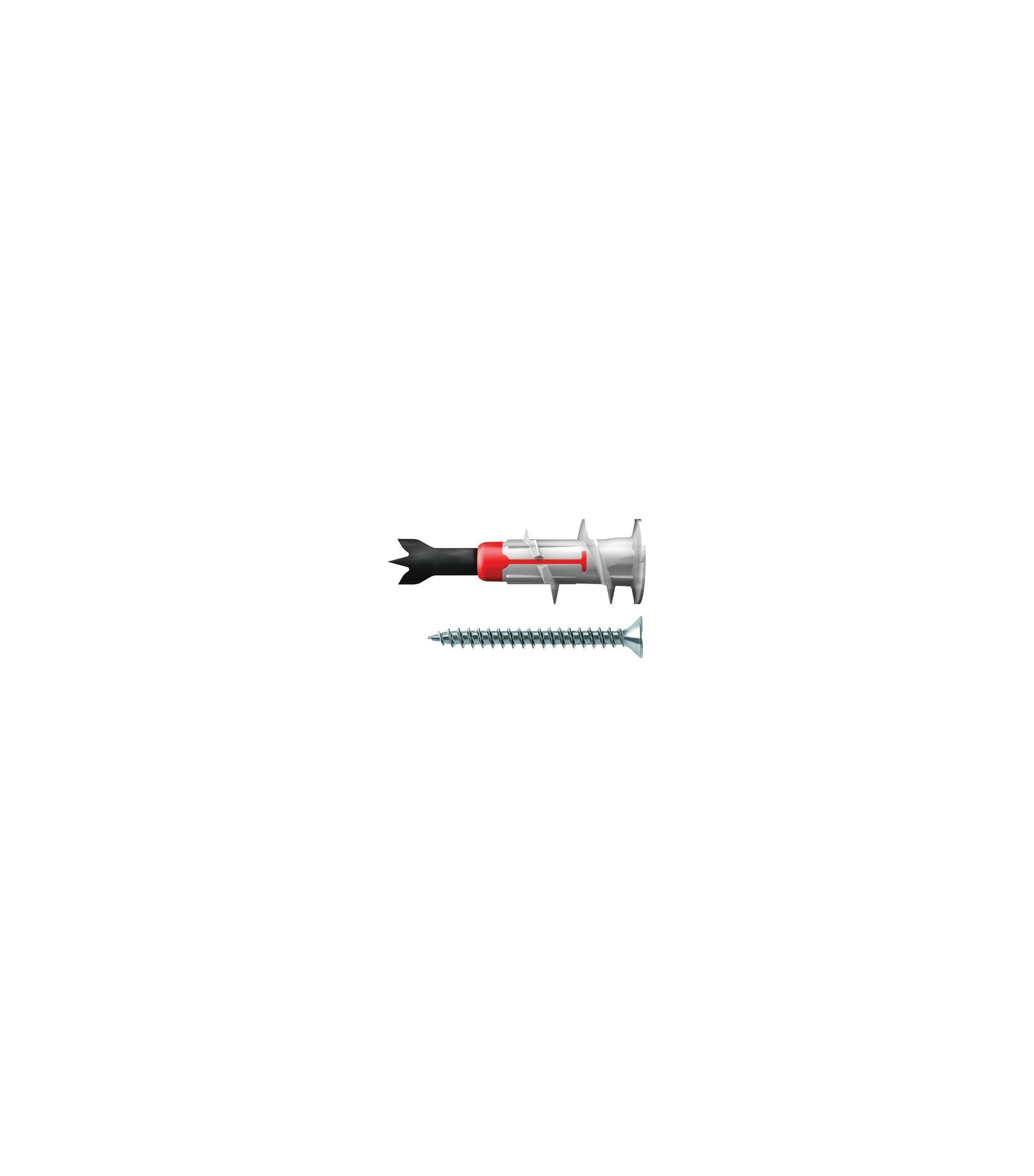 Tassello autoforante bimateriale a installazione ultra-rapida per lastre in cartongesso. Pronto alluso, la punta metallica preinstallata e puessere applicato direttamente. La punta autoforante e centrante consente di forare anche materiali rigidi. Le lamelle anti-rotazione garantiscono il bloccaggio del tassello in fase di installazione della vite. Installabile senza preforo per pannelli con spessore fino a Mm. 25. Vite Mm. 4,5x40.
