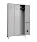 In lamiera di acciaio pressopiegata, con pretrattamento di fosfosgrassaggio e verniciatura a forno continuo. Colore grigio RAL 7035. Allestito con porta asciugamani, appendiabiti, ripiano interno, feritoie e portacartellino. Con serratura a cilindro con doppia chiave in dotazione.