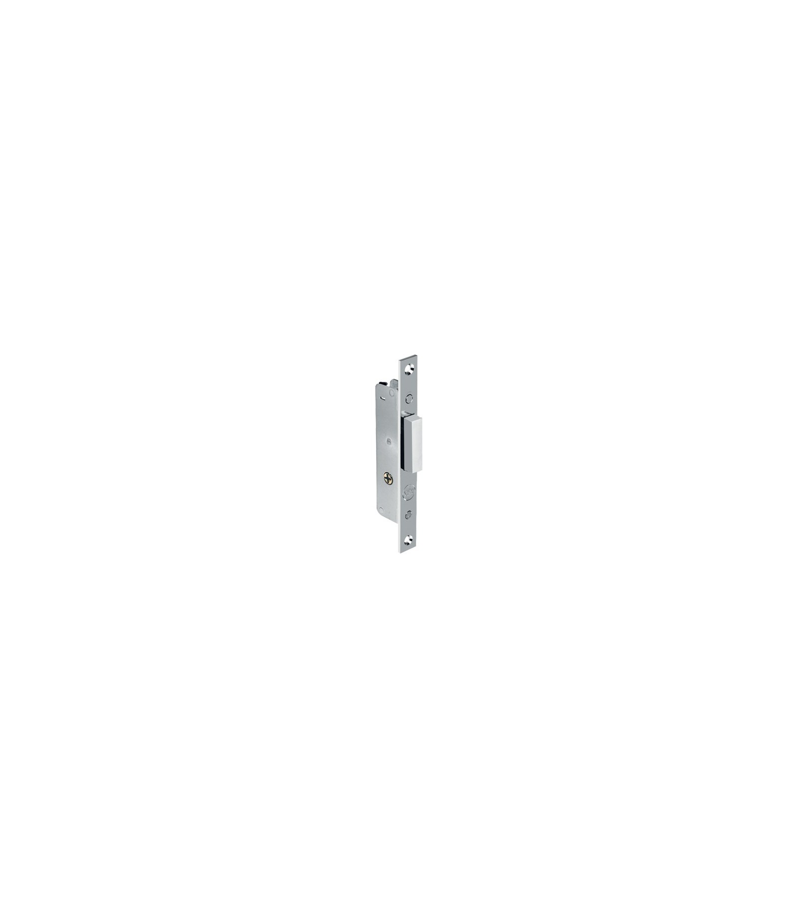 Con cilindro a croce. Chiusura con catenaccio avanzante a 1 mandata. Frontale in acciaio nichelato con bordo quadro da Mm. 16x148. Altezza scatola Mm. 103. In dotazione: 3 chiavi, contropiastra, 2 mostrine in plastica e viti di fissaggio.