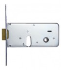 Scrocco con catenaccio incorporato. Chiusura a 2 mandate da Mm. 10. Quadro maniglia Mm. 8. Frontale in acciaio zincato con bordo quadro da Mm. 16x160. Scatola altezza Mm. 64. In dotazione: vite di fissaggio cilindro e 3 chiavi piatte.