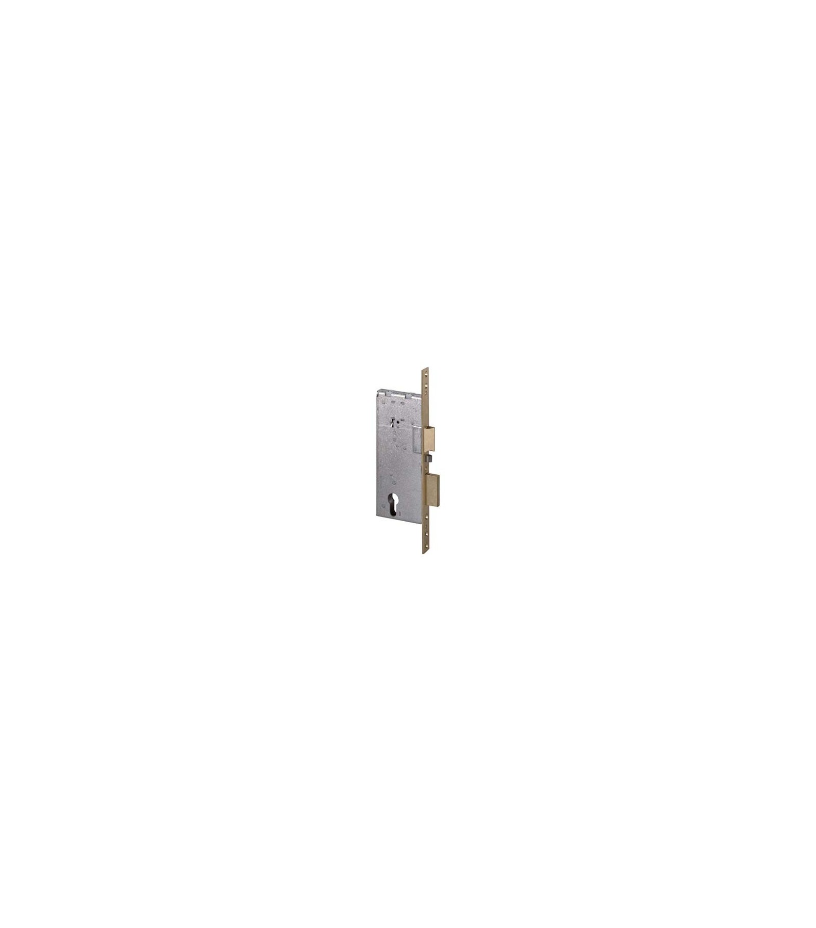Per cilindro sagomato. Scrocco reversibile elettrificato 12V. Chiusura con catenaccio a 2 mandate, con ritorno automatico. Frontale con bordo quadro da Mm. 22x264. Altezza scatola Mm. 183. In dotazione: 1 incontro e viti di fissaggio.