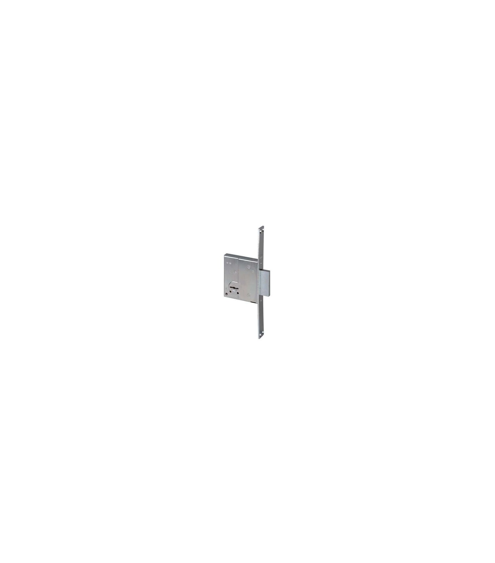 A doppia mappa. Chiusura con catenaccio a 2 mandate. Borchia interna in acciaio. Frontale in acciaio zincato con bordo quadro da Mm. 22x177. Altezza scatola Mm. 93. In dotazione: 2 chiavi.