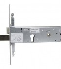 Per cilindro sagomato. Scrocco separato reversibile e regolabile. Chiusura triplice con catenaccio a 3 mandate e agganci aste a vite. Quadro maniglia Mm. 8. Frontale in acciaio zincato con bordo quadro da Mm. 22x240. Altezza scatola Mm. 64. In dotazione: 2 ghiere, coppia spessori sottofrontale, grano interno per fissaggio cilindro e viti fissaggio.