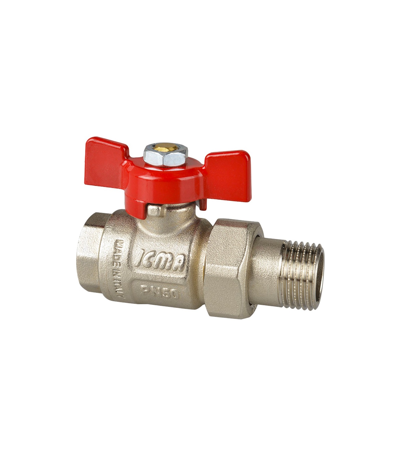 Valvola a sfera a passaggio totale con bocchettone, Farfalla in alluminio verniciato rosso. Filettatura M/F. Asta comando antiscoppio doppio O-ring. Idonea per acqua in impianti di riscaldamento/ raffrescamento. Filettatura ISO 228.