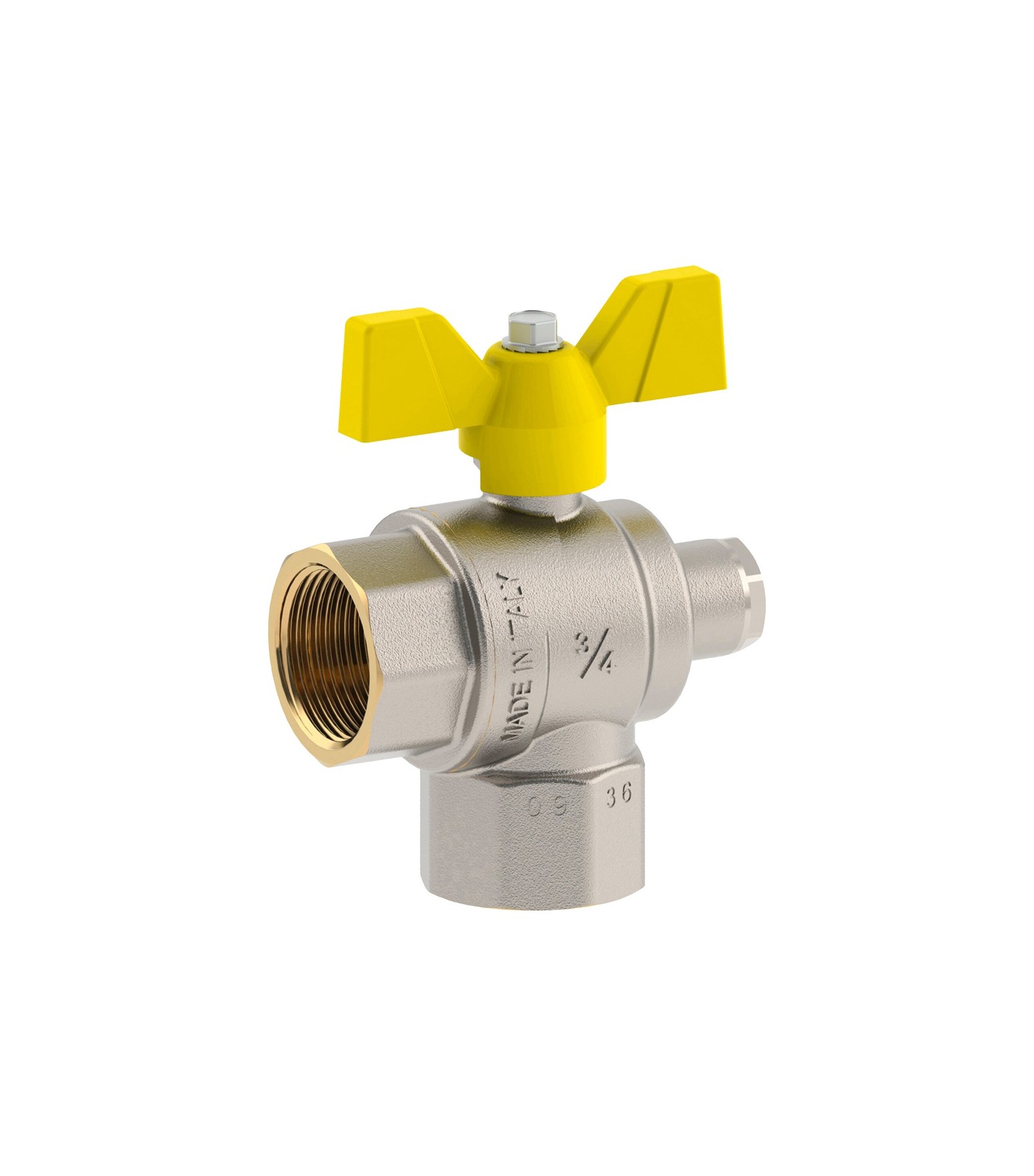 Valvola a sfera a squadra per gas nichelata, attacco Femmina-Femmina, con attacco di pressione, con maniglia a Farfalla in alluminio verniciata gialla.