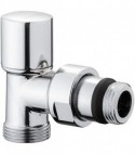 Da abbinare con valvola ns codice 08008. Adattatori ns codice 08020 e 08022. Detentore micrometrico a squadra per il collegamento di tubo rame, multistrato e pe-x. Corredato di bocchettone antisgocciolamento. Finitura cromata lucida.