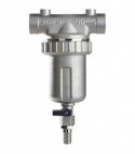 MAgliatura filtro da 100 UM Il filtro autopulente deve essere installato subito dopo il contatore e prima di qualsiasi altro apparecchio, assicurandosi che il senso del flusso d'acqua coincida con il senso della freccia stampata sul corpo. Durante il passaggio dell'acqua nel filtro, grazie alla cartuccia filtrante posta all'interno di esso, tutte le impurità vengono bloccate e si depositano sul fondo del bicchiere. Montando due manometri sul corpo possiamo controllare lo stato di funzionamento del filtro, in quanto la differenza di lettura fra la pressione in entrata e la pressione in uscita è direttamente proporzionale all'intasamento della cartuccia, quindi pi— è grande il divario tra le due pressioni pi— il filtro è intasato e necessita una pulizia. Per eseguire la pulizia del filtro occorre aprire per qualche secondo la valvola a sfera posta sotto il bicchiere, in questo modo le impurità presenti sul fondo vengono espulse. Se la cartuccia necessita di una pulizia pi— accurata, eseguire, se il tipo di impianto lo permette, un controlavaggio (flusso dell'acqua in senso inverso rispetto al senso della freccia stampata sul corpo), oppure manualmente (ad es. con aria compressa) estraendo dal filtro la cartuccia mediante lo smontaggio del bicchiere fissato al corpo mediante la ghiera di serraggio.