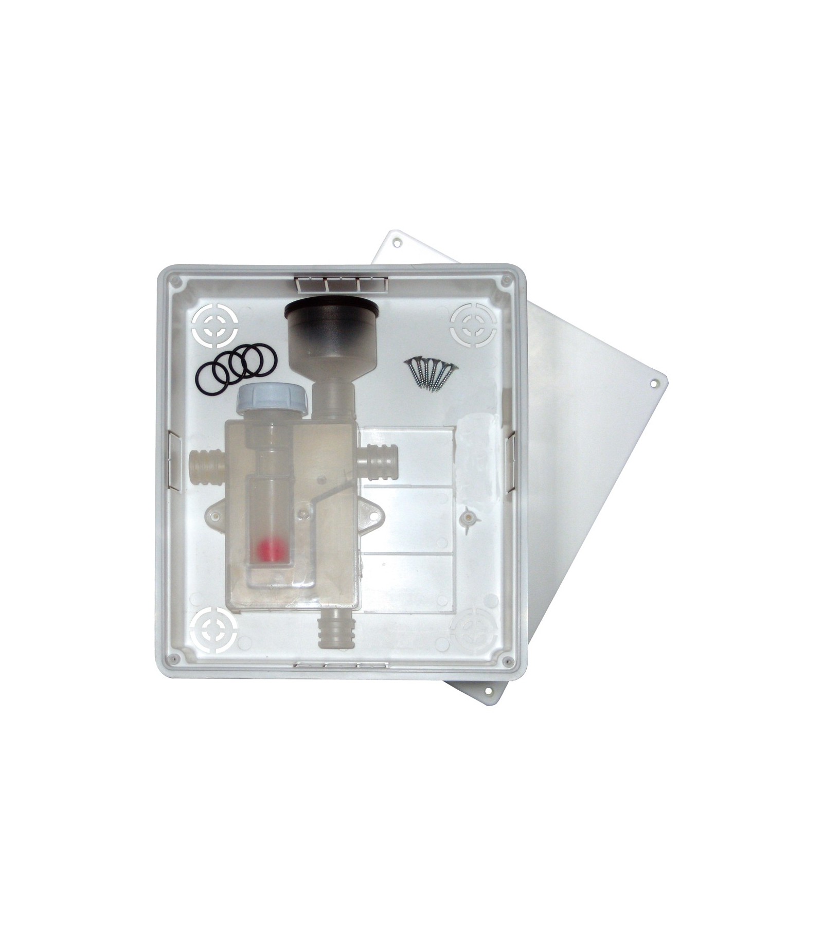 Il kit comprende: Sifone con tappo ispezionabile e sfera, Guarnizione tecnica, O-ring di tenuta e Scatola con coperchio e viti. Colonna di chiusura idraulica da 70 mm. Raccordo superiore di entrata acqua in gomma. Componenti interni smontabili per ispezione e pulizia periodica. Corpo del sifone realizzato con due entrate e due uscite orizzontali e verticali, che consentono l'installazione sia da dx che da sx, indipendentemente dal posizionamento. Uscita dello scarico da 18/20 mm per tubi corrugati. Il sifone funziona solo in senso verticale con il raccordo superiore di entrata acqua posizionato in alto. Portata 100 l/h