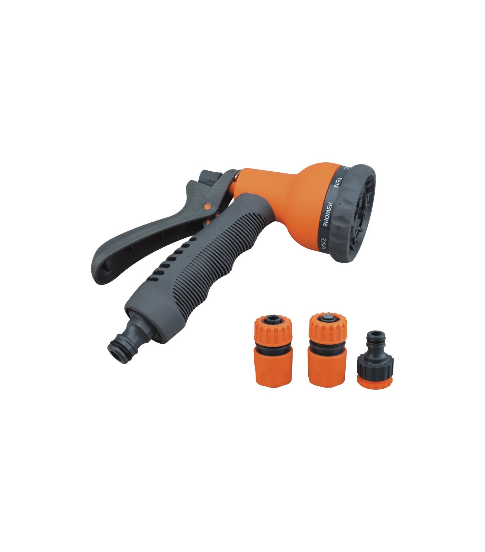 Composto da: pistola per innaffiare 8 getti, presa rubinetto 3/4F con riduzione 1/2, raccordo rapido e raccordo rapido Acquastop.