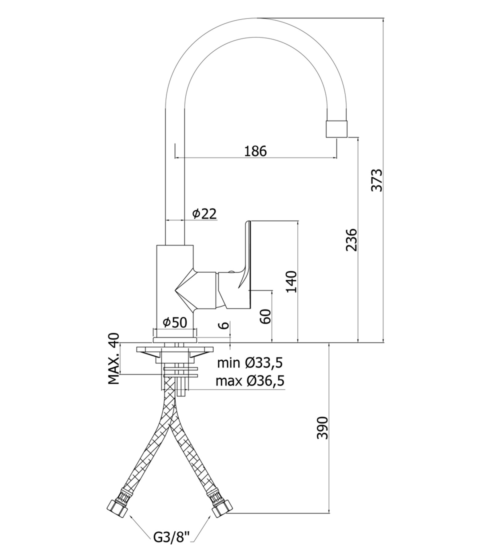 Miscelatore lavello monoforo con canna orientabile completo di: