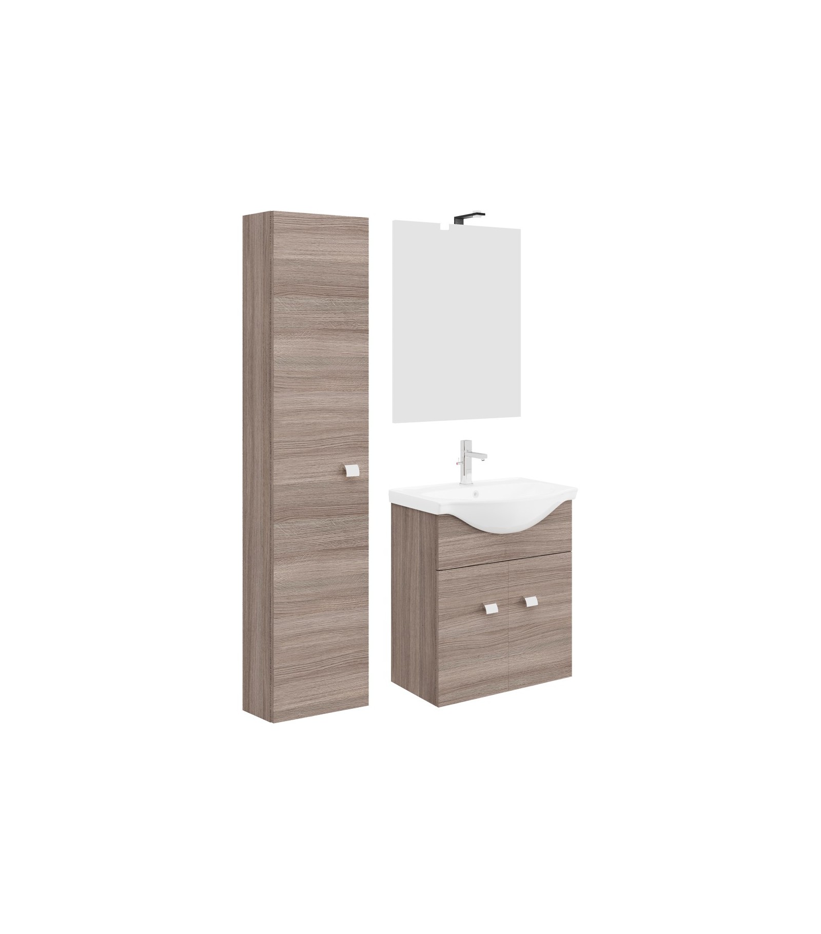 Base in laminato nobilitato, con ante in MDF laminato, maniglie in ABS cromato, porta asciugamani in metallo cromato Installabile Dx o Sx e lavabo da incasso in ceramica.
