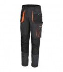 65% poliestere e 35% cotone da Gr. 180. Inserti e ginocchiere in Oxford" poliestere/PU da Gr. 220. Con due ampie tasche anteriori dotate di inserti porta minuteria con chiusura a strappo. Tascone laterale sinistro con chiusura a strappo dotato di taschino porta cellulare ed inserto porta badge. Tasconi posteriori con rinforzi in Oxford e chiusura a strappo. Tasca porta metro e nastro porta martello. Tasche per ginocchiere. Colore grigio con inserti arancione. Utilizzo primavera estate.