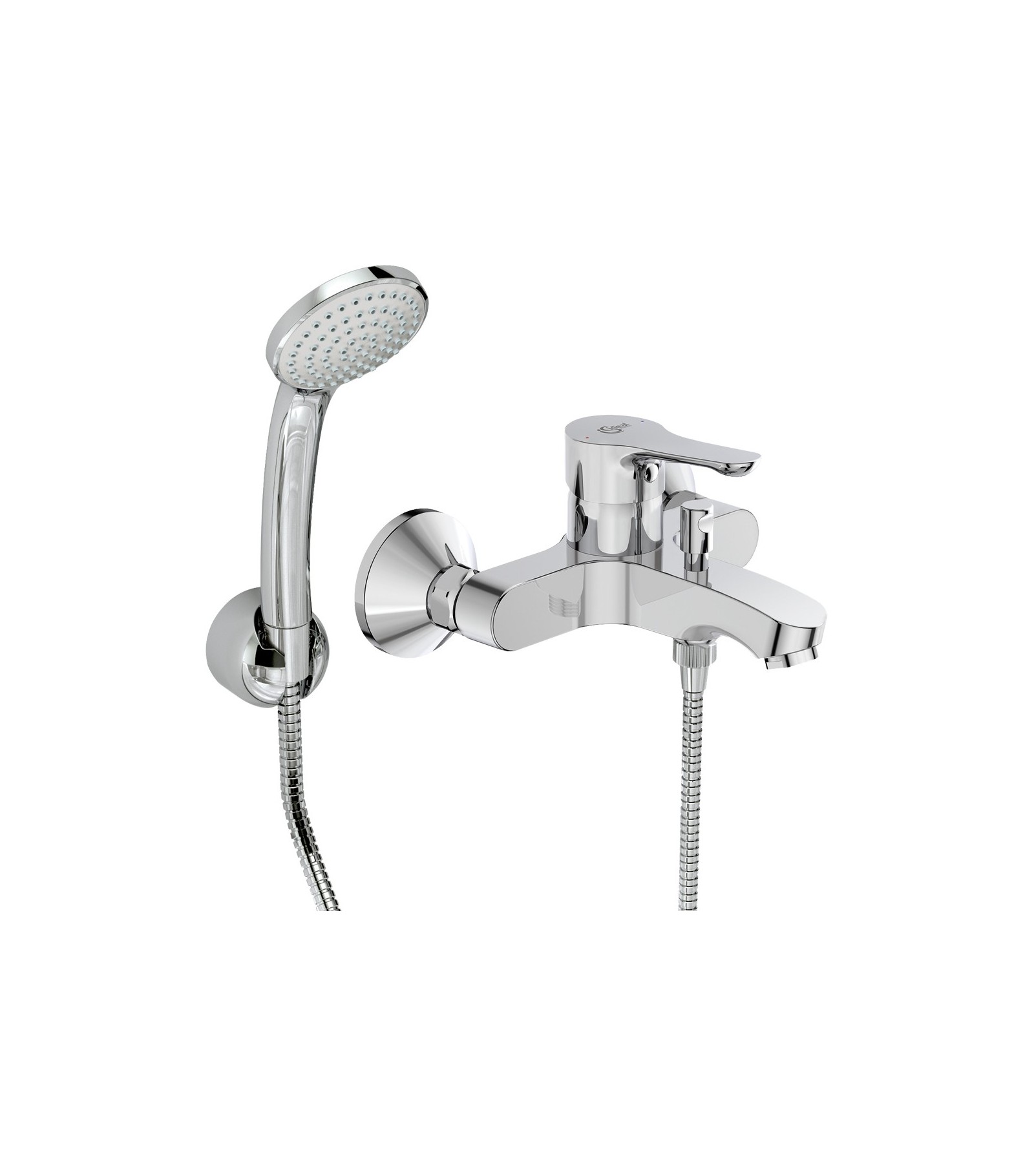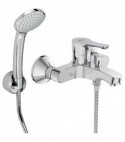 Miscelatore monocomando esterno per vasca/doccia. Dotato di eccentrici per interasse da 129 mm a 171 mm. Fornito completo di: - Doccetta 1 getto fisso, - Supporto a muro, - Tubo flessibile da 1500 mm. Materiale: Ottone cromato. Numero di certificato: EN 817. Cartuccia di ricambio nostro codice 0358302.