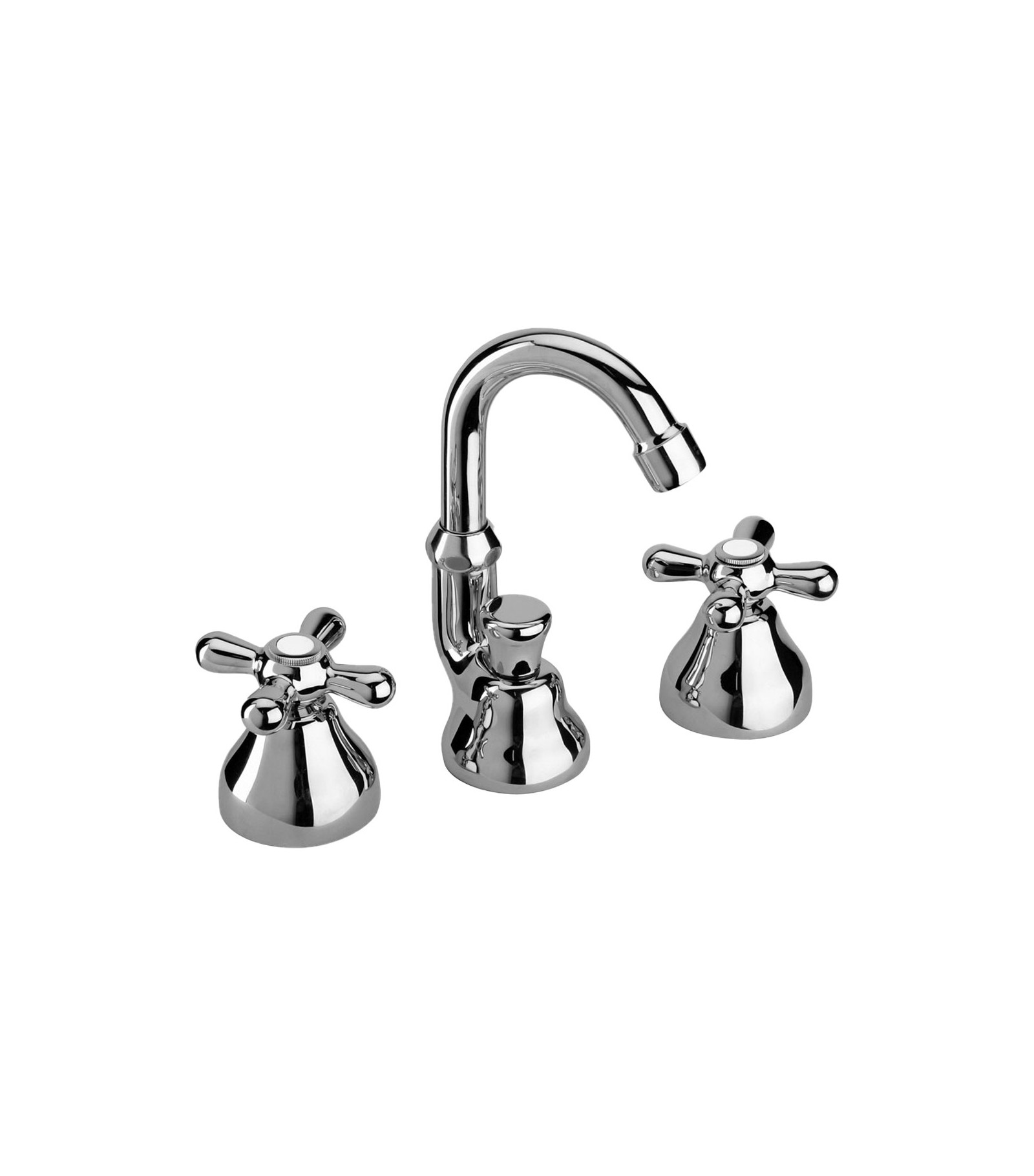 Batteria bidet a 3 fori, con manopole a croce e canna alta orientabile. Finitura: Cromo Stile rubinetteria tradizionale. Fornito completo di Piletta di scarico automatico da 11/4. Con Vitone ceramicato.