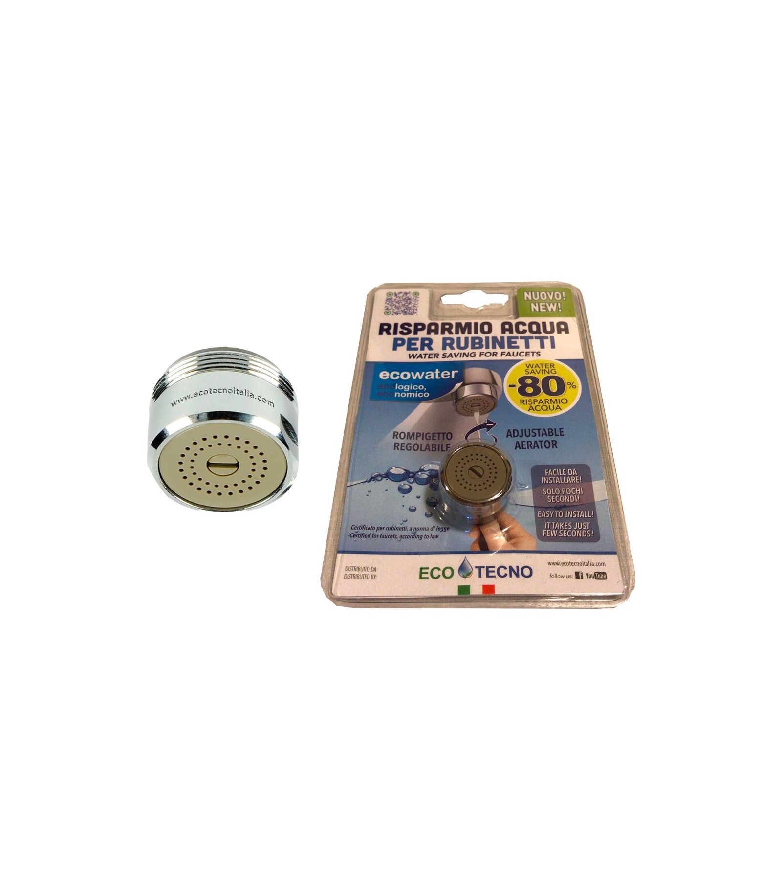 Con rompigetto regolabile. Certificato per rubinetti a norma di legge. Risparmio d'acqua del 80%. Con rompigetto regolabile. Certificato per rubinetti a norma di legge. Risparmio d'acqua del 80%. Gli economizzatori d'acqua della Ecotecno sono certificati in Italia per uso alimentare nel prelievo d'acqua dai rubinetti. Gli Ecowater commercializzati dalla Ecotecno, non sono a membrana fissa di contenimento della pressione, ma hanno un sistema brevettato di regolazione del flusso, che sfrutta il principio della fisica scoperto dal noto fisico Italiano, Giovanni Battista Venturi, detto appunto Effetto Venturi, in cui una massa d'acqua ridimensionata da un restringimento della sezione del tubo in cui circola, fa aumentare la sua velocità, che consente appunto di risparmiare oltre l'80% di acqua.