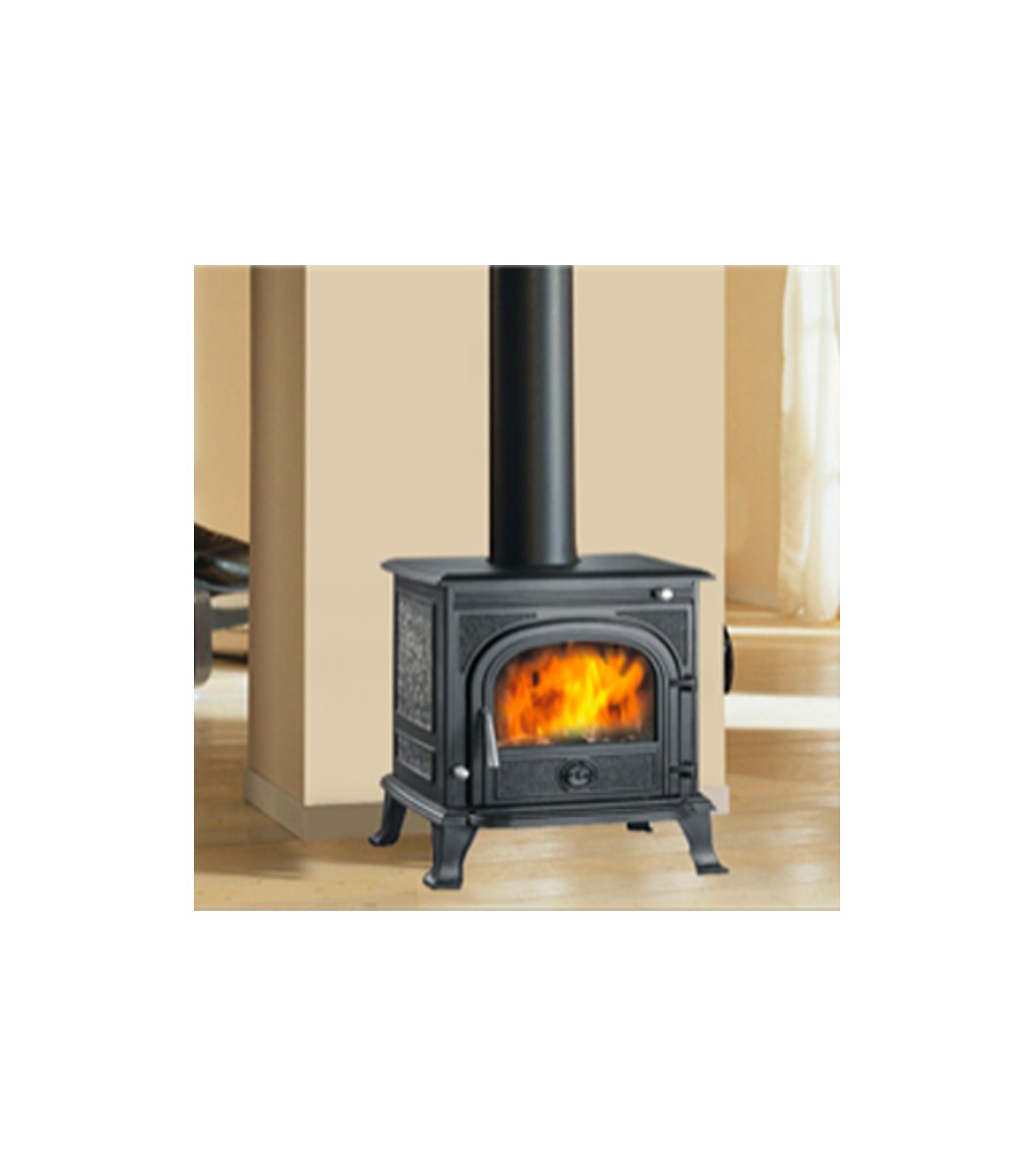 Stufa in ghisa colore nero. Potenza termica nominale 8kw. Volume riscaldabile 220 m3. Porta di carico frontale. Uscita fumi superiore e/o posteriore diam. 150. Peso 125 kg. Vetro e vernice resistente alle alte temperature. EN13240: 2001 EN13240 / A2: 2004