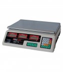 Con display LCD a 3 quadranti su due lati. Tastiera laterale. Piatto in ferro da Cm. 34x23, supporto plastica. Alimentazione a batteria integrata ricaricabile 6V 4Ah. Divisione pesata Gr. 2. Prodotto certificato CE. Manuale uso e cavo caricatore incluso. Adatto per uso domestico.