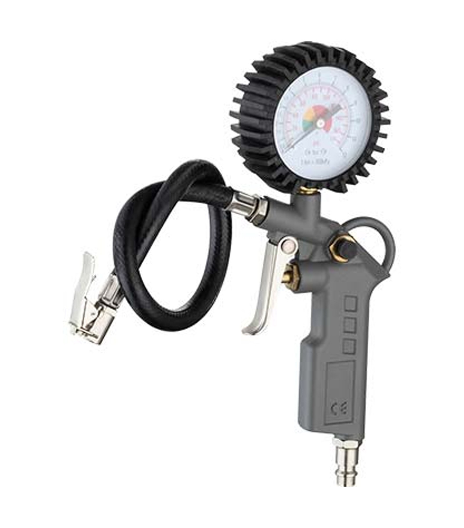 In alluminio pressofuso. Con manometro. Con pulsante sgonfiaggio rapido. Attacco rapido.