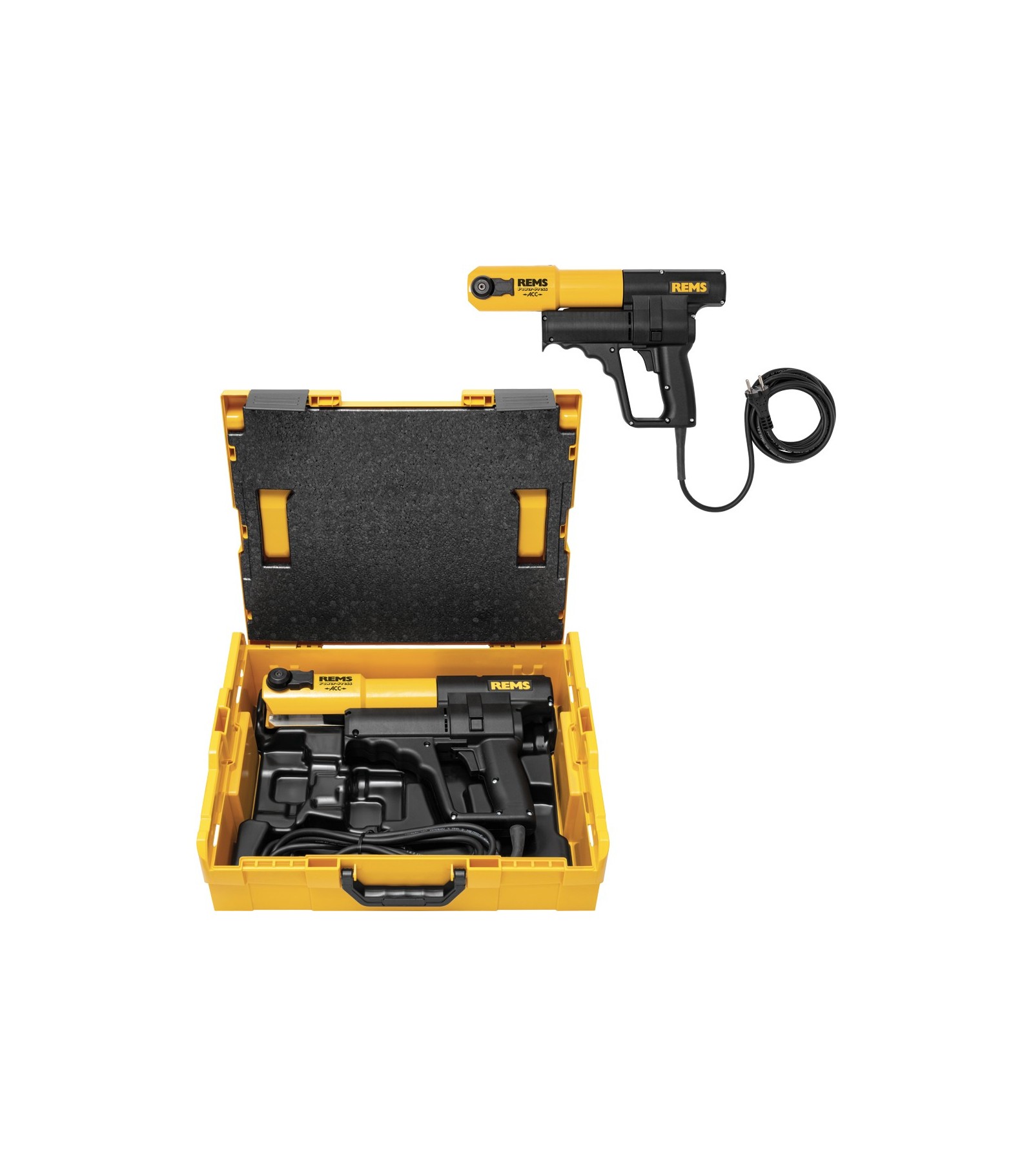 Pressatrice radiale elettroidraulica con segnale di spegnimento al termine della pressatura (forzato) per la realizzazione di giunzioni a pressione 10-108 (110) mm, 3/8-4. Per l'utilizzo con pinze a pressare/anelli a pressare REMS e pinze a pressare adatti di altre marche.