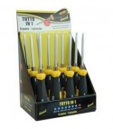 Con impugnatura bimateriale antiscivolo. Confezione da 12 pezzi con dotazione di inserti Phillips, Pozidriv e Taglio. Contenuto: Taglio Mm. 6, PH0, 1, 2 e 3, PZ1, 2 e 3.