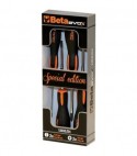 In acciaio cromato. Punta con finitura nera, protetta dall'ossidazione con un trattamento di fosfatazione. Impugnatura ergonomica bimateriale. Impronta e misura sono riportate sulla calotta sferica dell'impugnatura. Composto da 4 giraviti: 2 a taglio (3x75, 5,5x100) e 2 Phillips (PH1x80 e PH2x100).